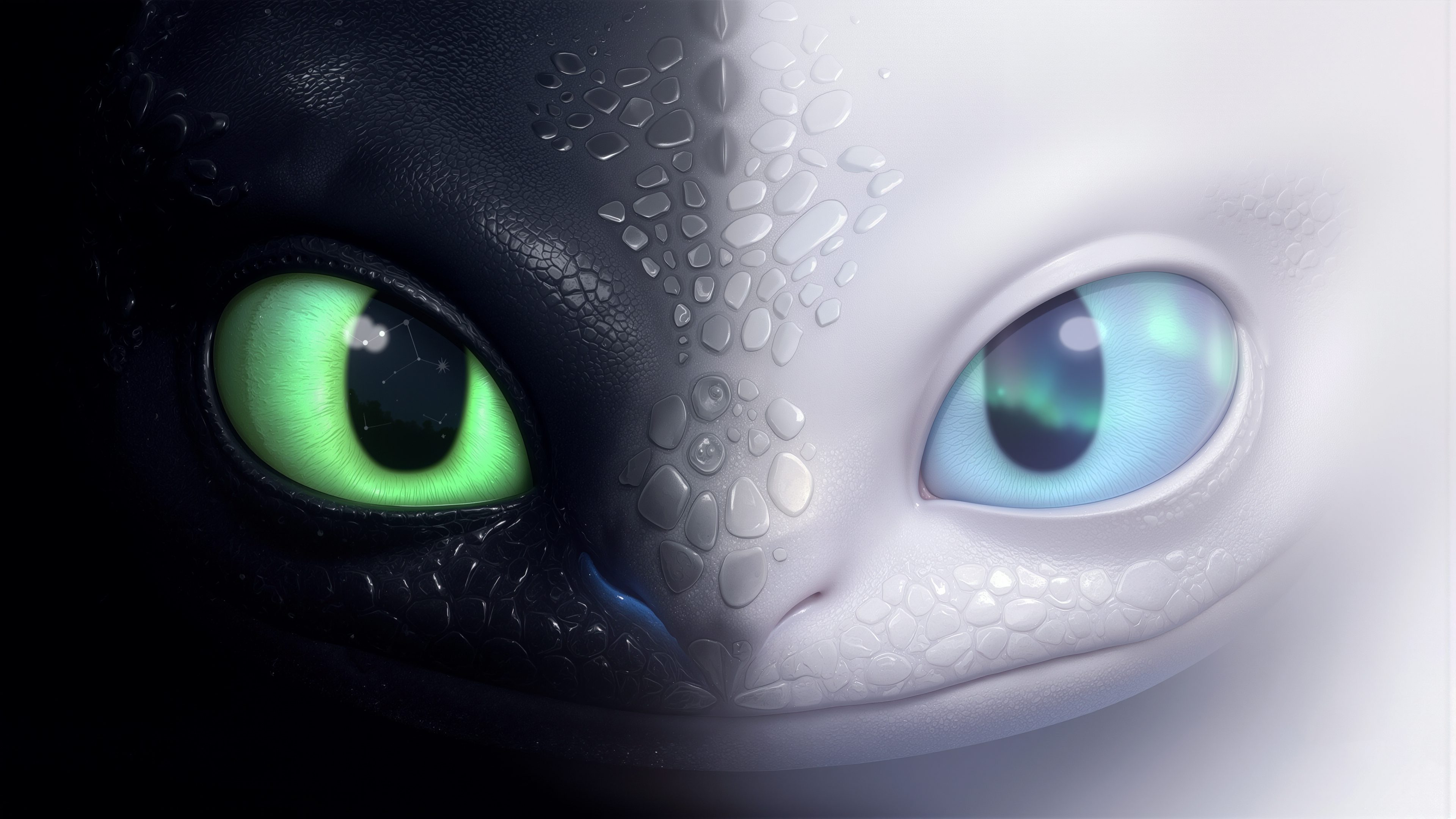 A stunning 4K fantasy wallpaper featuring a perfectly split dragon face โ half consumed by shadow, half bathed in pure light.