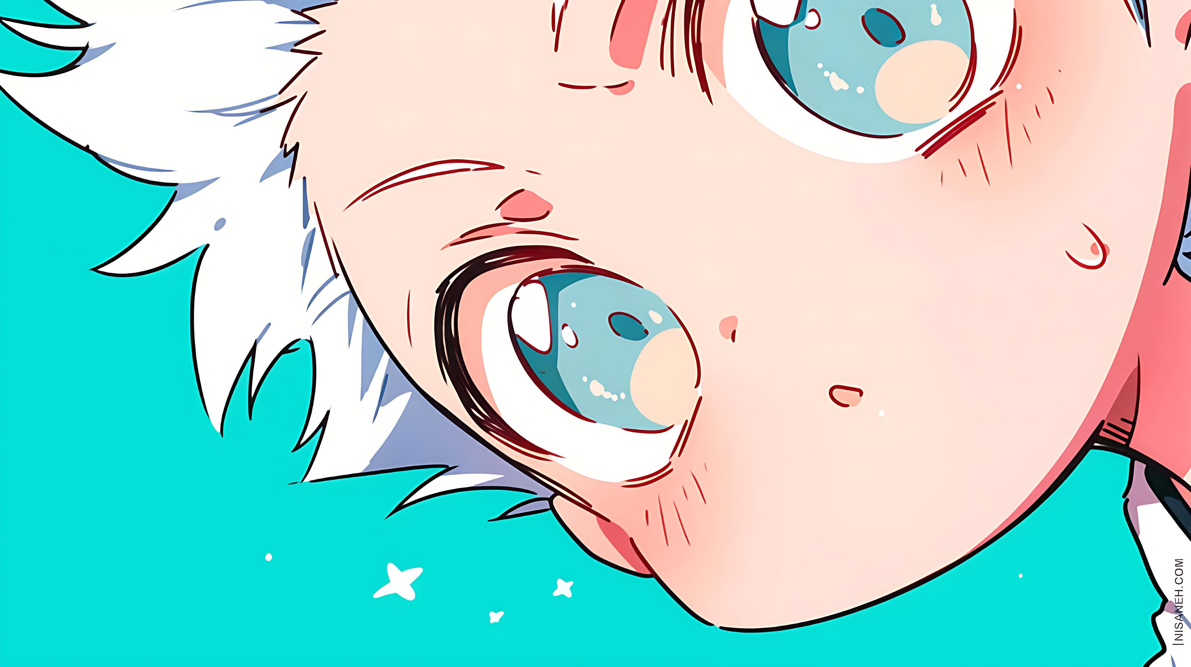 Dive into a bright and expressive anime aesthetic with this stunning 4K close-up wallpaper, featuring a cute white-haired character with crystal-blue eyes and vibrant turquoise background elements. The artwork captures a playful angle and soft color palette, making it perfect for anime fans who love clean, modern, and eye-catching visuals on their devices.