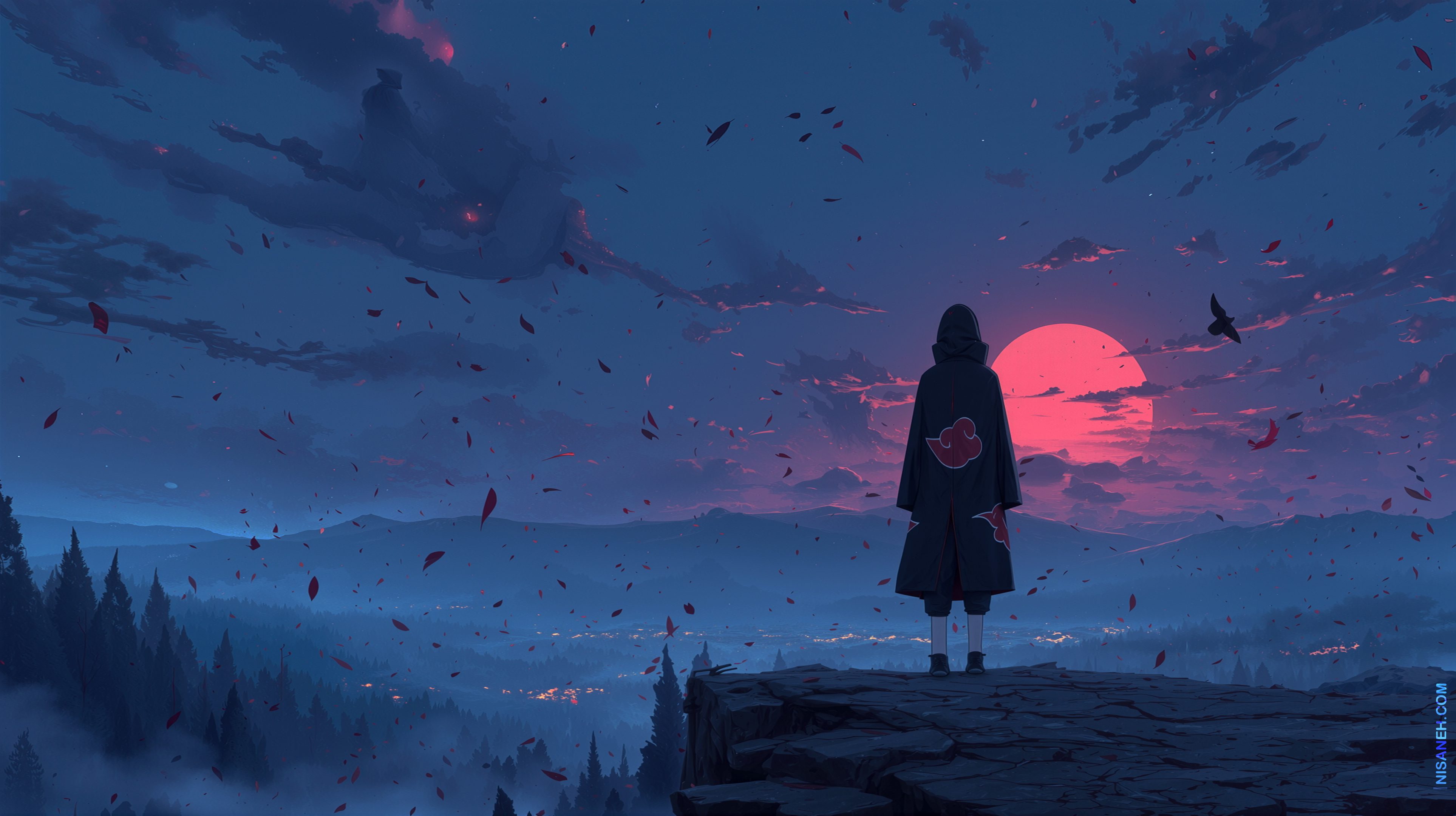 A striking 4K anime wallpaper of Itachi Uchiha standing on a cliff overlooking a glowing sunset. The drifting red leaves, dramatic sky, and Akatsuki cloak create a powerful, atmospheric scene perfect for Naruto fans.