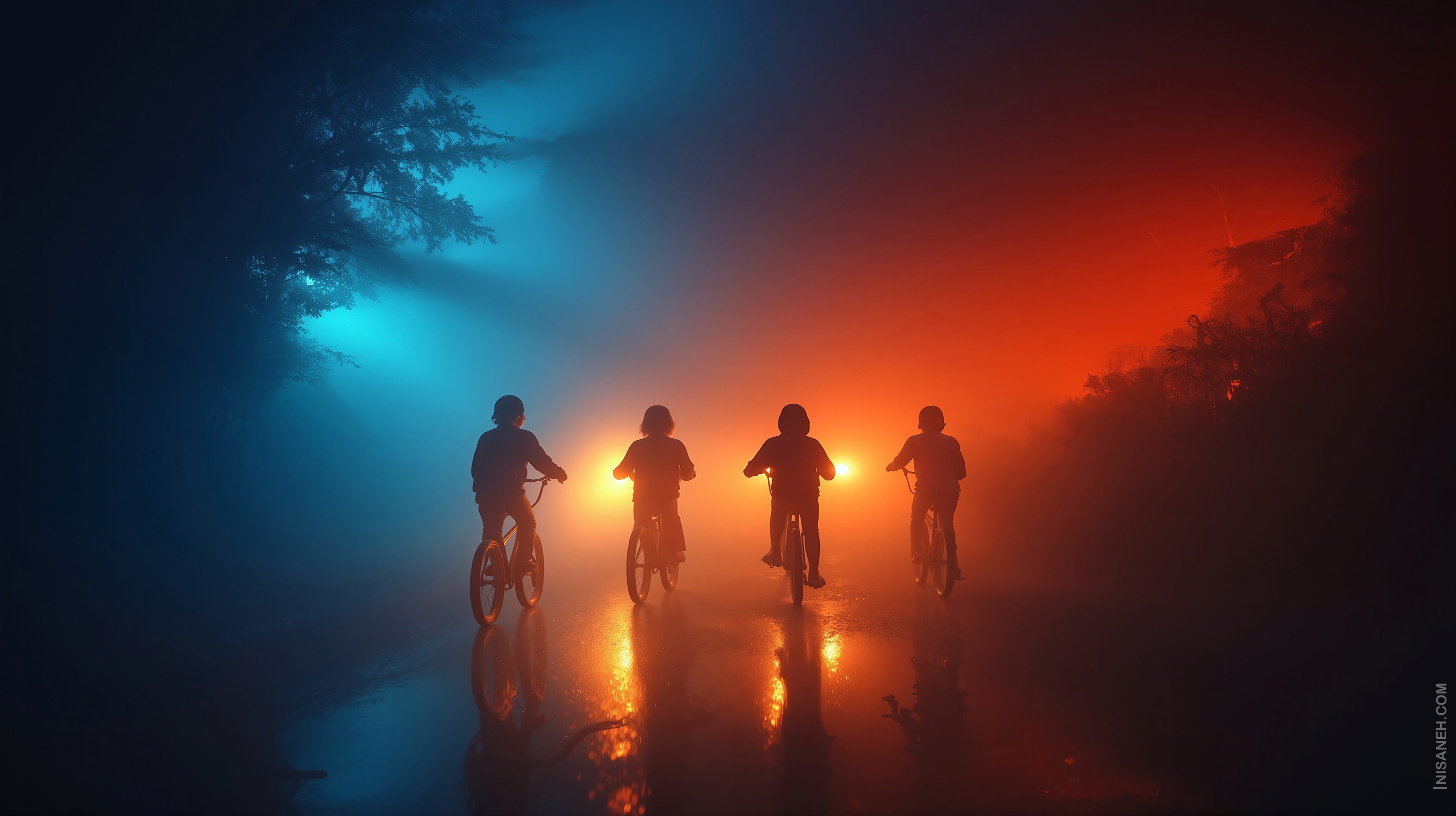 Four young riders cycle through a fog-covered forest road, illuminated by dramatic blue and red neon light that splits the scene into two contrasting realms.