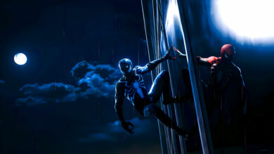 🕷️ Step into the night with Spider-Man and his symbiote-powered alter ego in this stunning cinematic wallpaper! Perfect for Marvel…