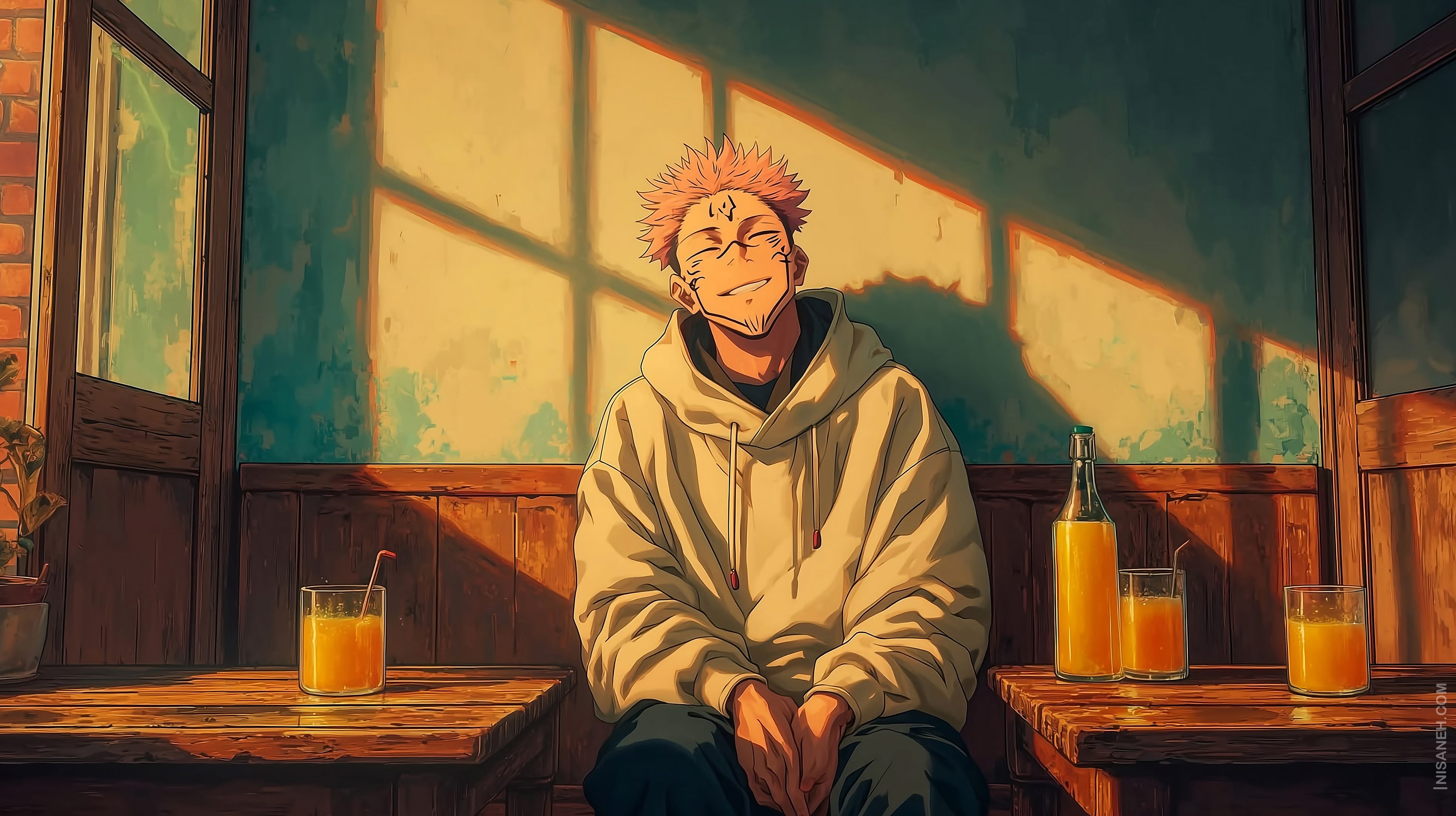 Bathed in soft golden sunlight, Yuji sits in a rustic café interior, smiling with pure serenity as the light pours through large window panels. The wooden textures, glass reflections, and rich orange tones of the juice create a calming cinematic atmosphere that contrasts beautifully with his usual intense, action-driven world.