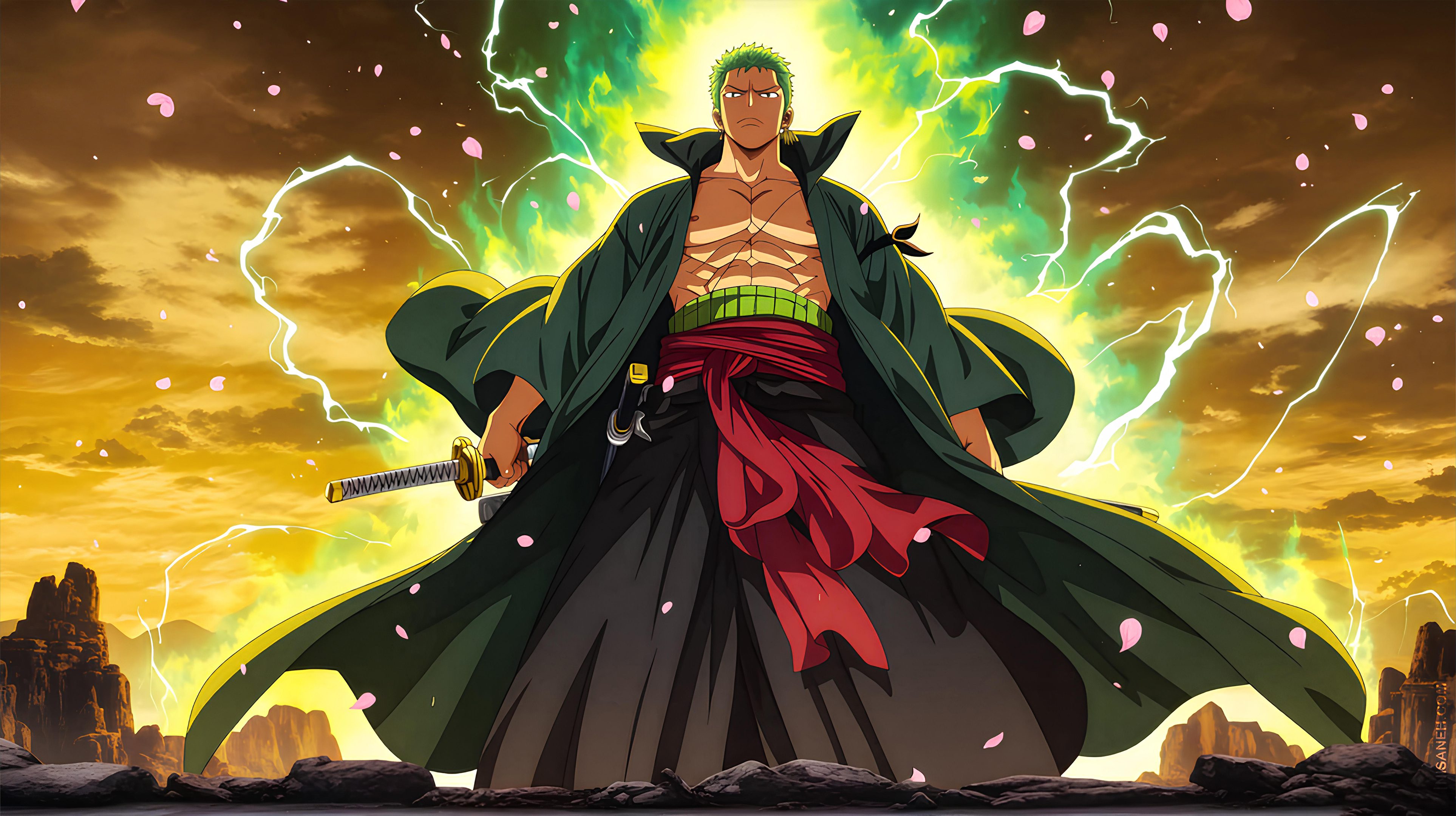 A powerful 4K anime wallpaper featuring Roronoa Zoro surrounded by an intense green aura, symbolizing his overwhelming strength and determination.